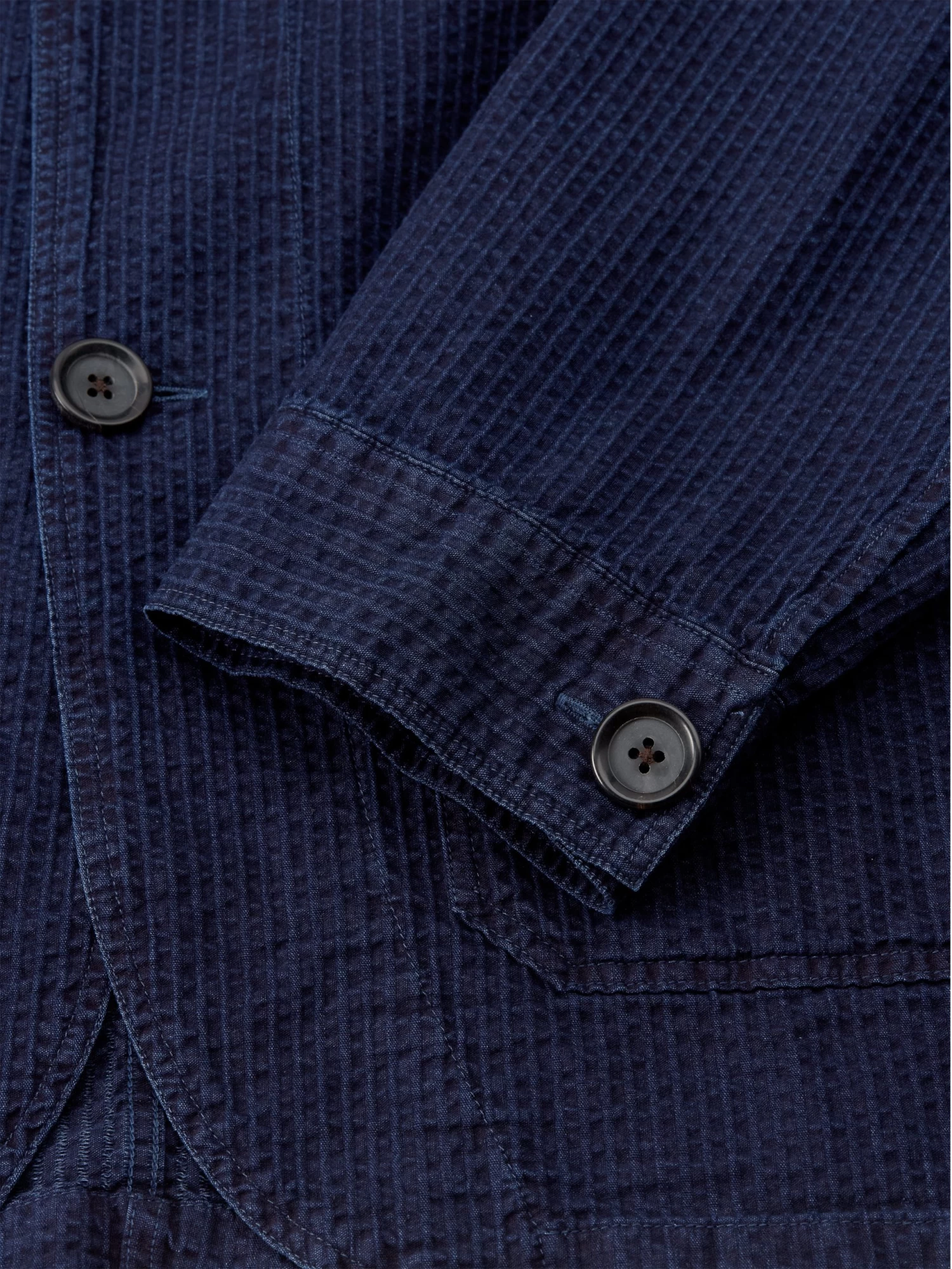 Oli has always loved combining relaxed tailoring techniques with workwear shapes, and the Bradwell is the latest evolution of this concept. Cut in a rich indigo-dyed cotton seersucker fabric perfect for the summer, the jacket riffs on railroad jackets of old and features a short lapel which can be turned up. Wear it with jeans for a double-denim look or pair it with light-coloured cotton trousers to maximise the contrast.