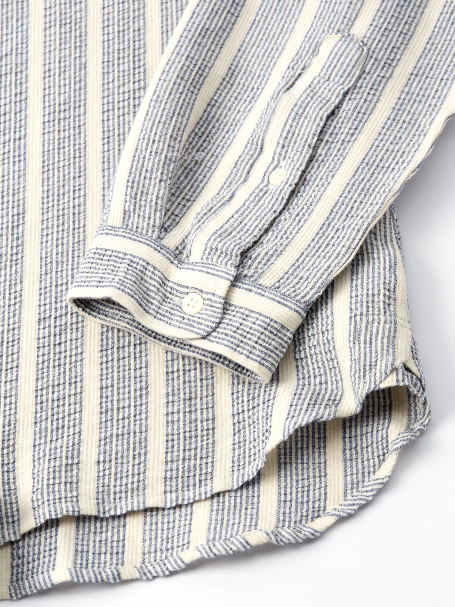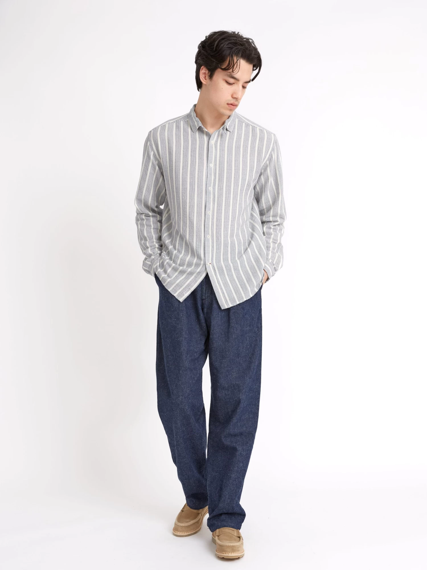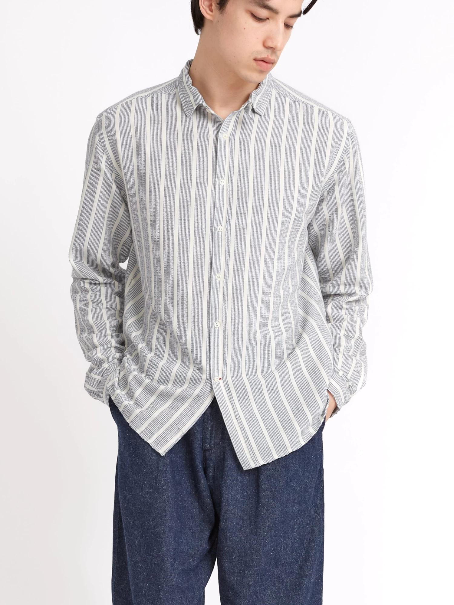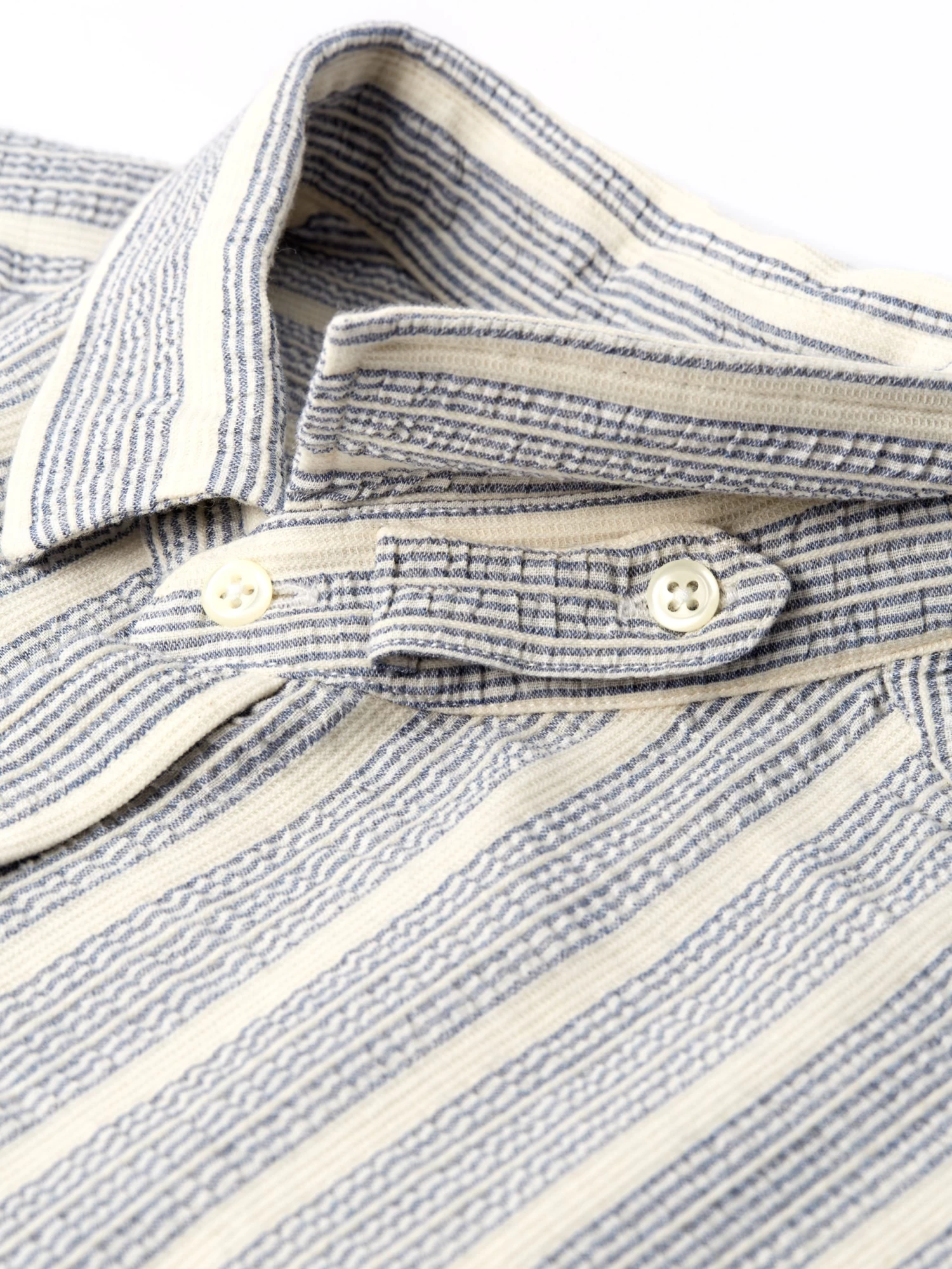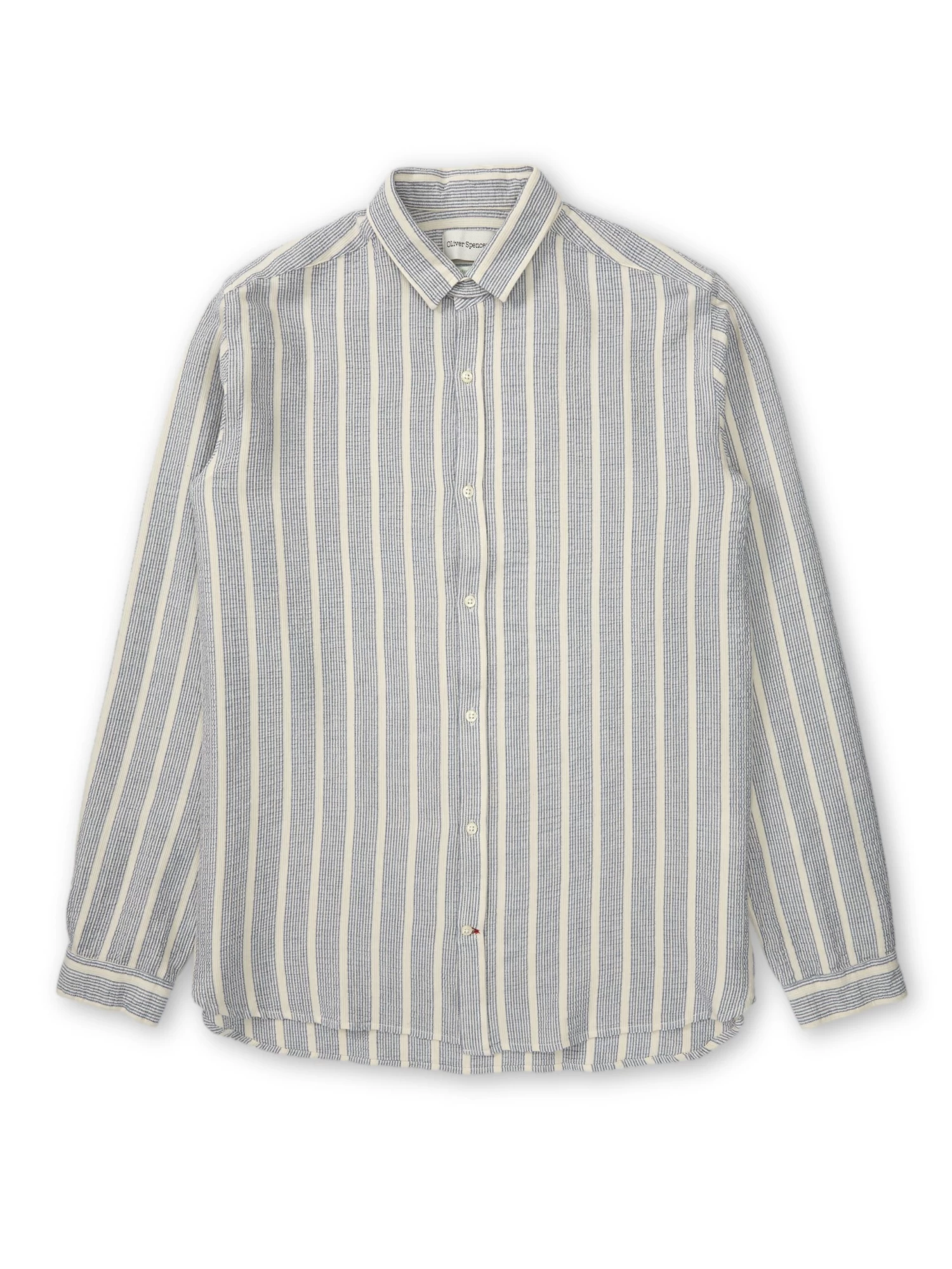 The Clerkenwell Tab Shirt is an Oliver Spencer favourite and a wardrobe staple. Featuring a slim, square collar that conceals an optional fastening tab, a soft one buttoned cuff and signature red bar-tacked button hole complete the subtle attention to detail that has become synonymous with Oliver Spencer. This version has been cut from an organic cotton blend with a textural blue stripe detail for a really tactile finish.