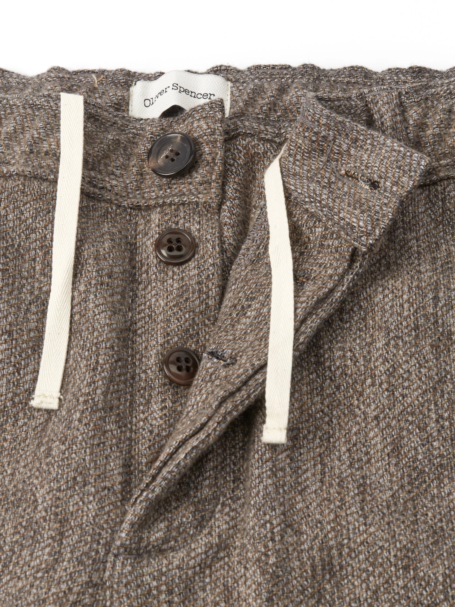 An Oliver Spencer classic, the drawstring trouser is a relaxed style cut straight through the leg with two back pockets, a cotton drawstring through the waistband and a button fly. This style is cut from a beautiful fawn tone cotton for a relaxed lightweight alternative to wool this winter.