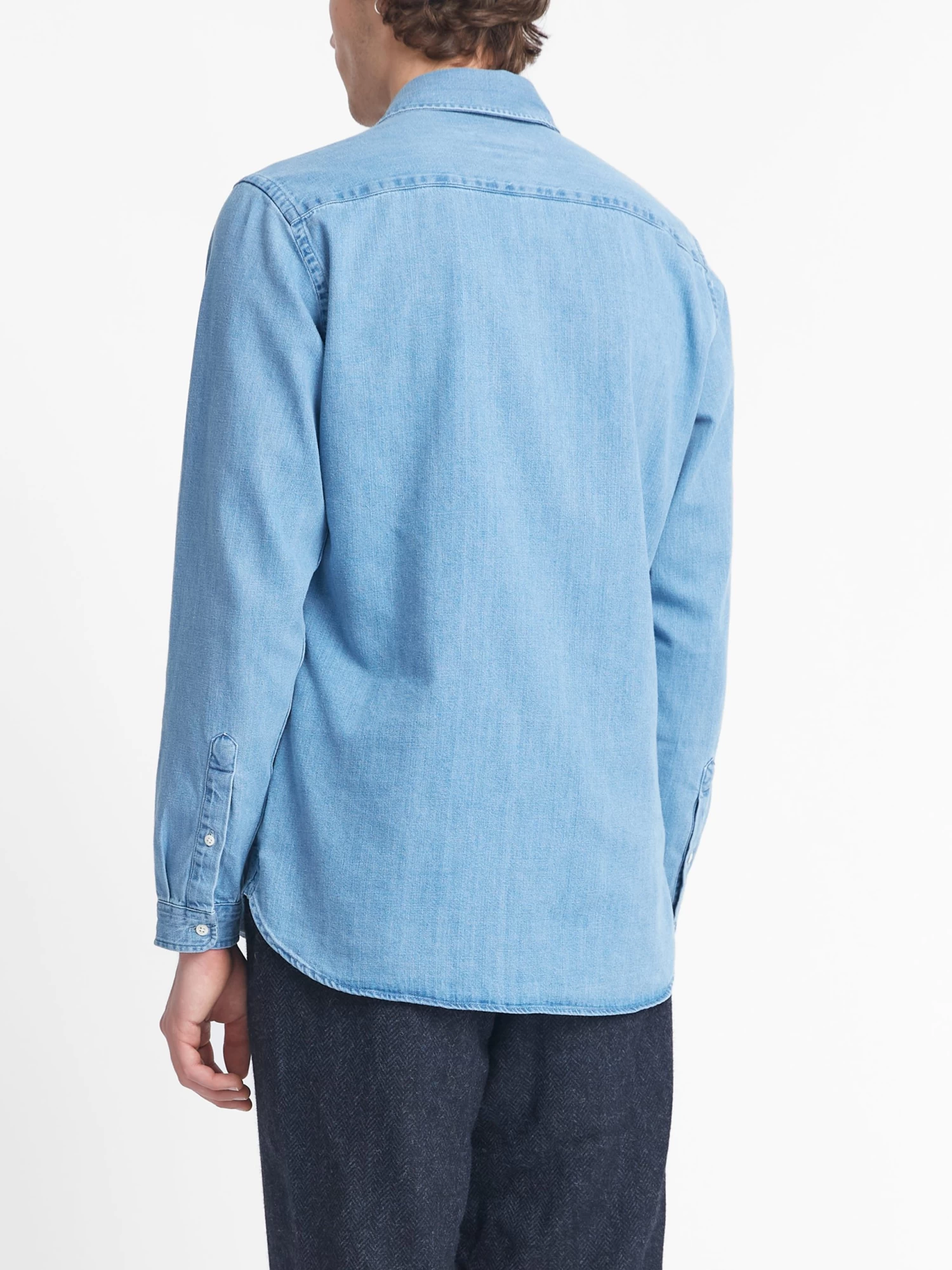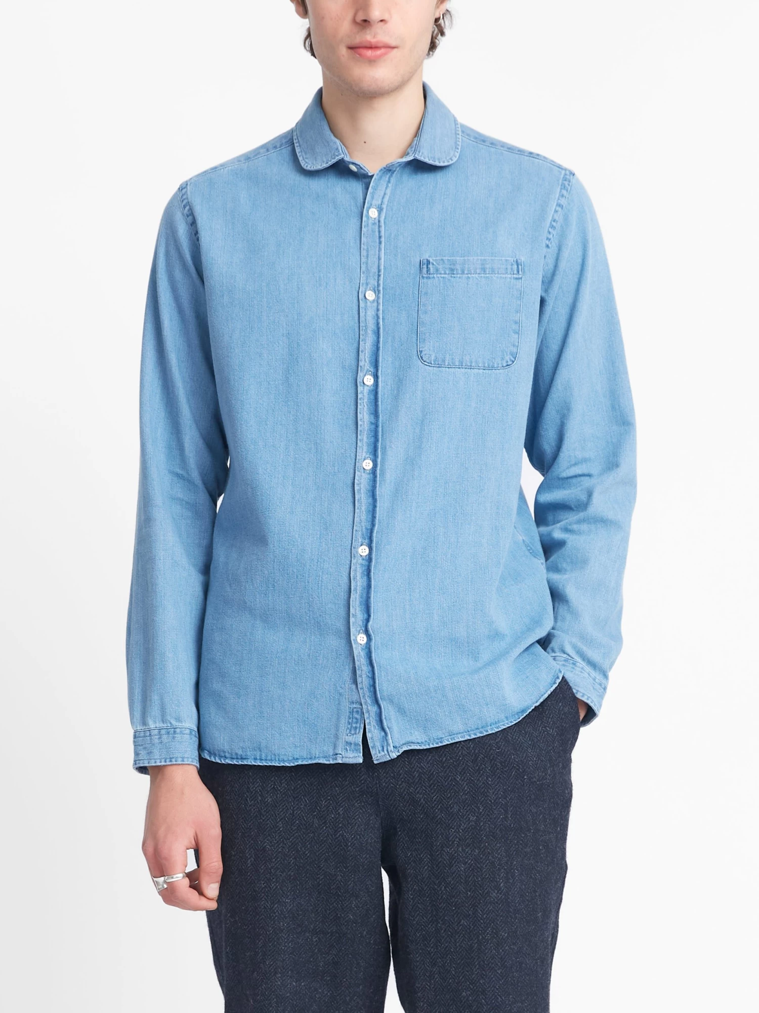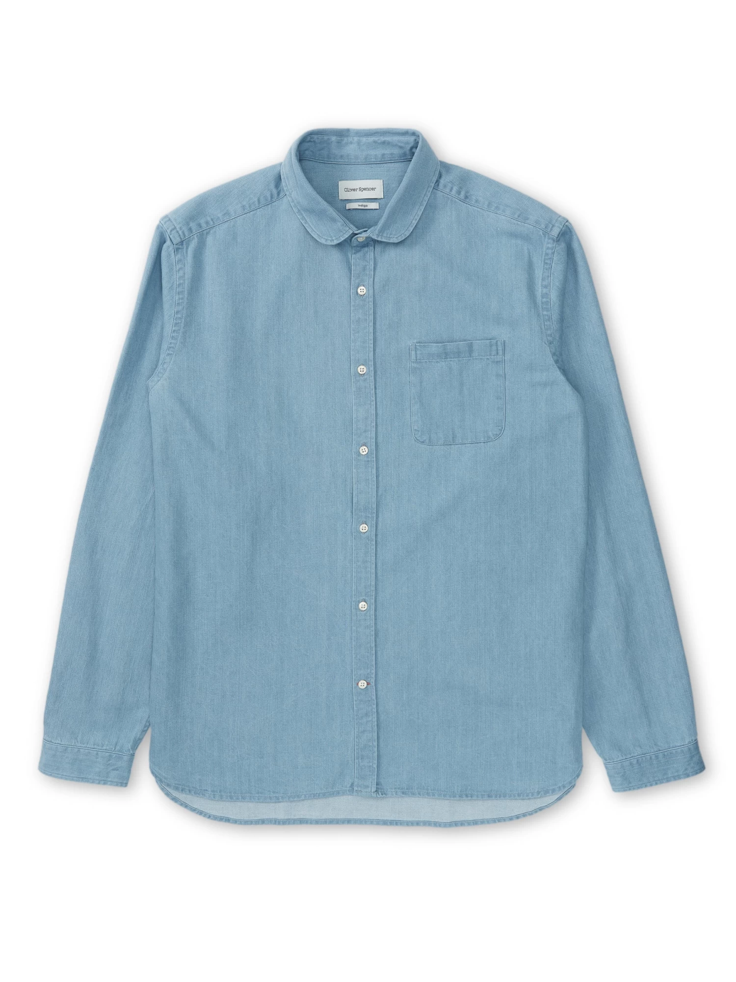 The Eton is one of our most popular collar shapes. Characterised by its neat curved shape, it is a relatively small collar which looks great buttoned up to the neck, with or without a tie, or can equally be worn unbuttoned. This classic denim version in a beautifully soft recycled cotton is great to pair with selvedge denim jeans for a double-denim look, or alternatively wear it with cream trousers for a preppy aesthetic.
