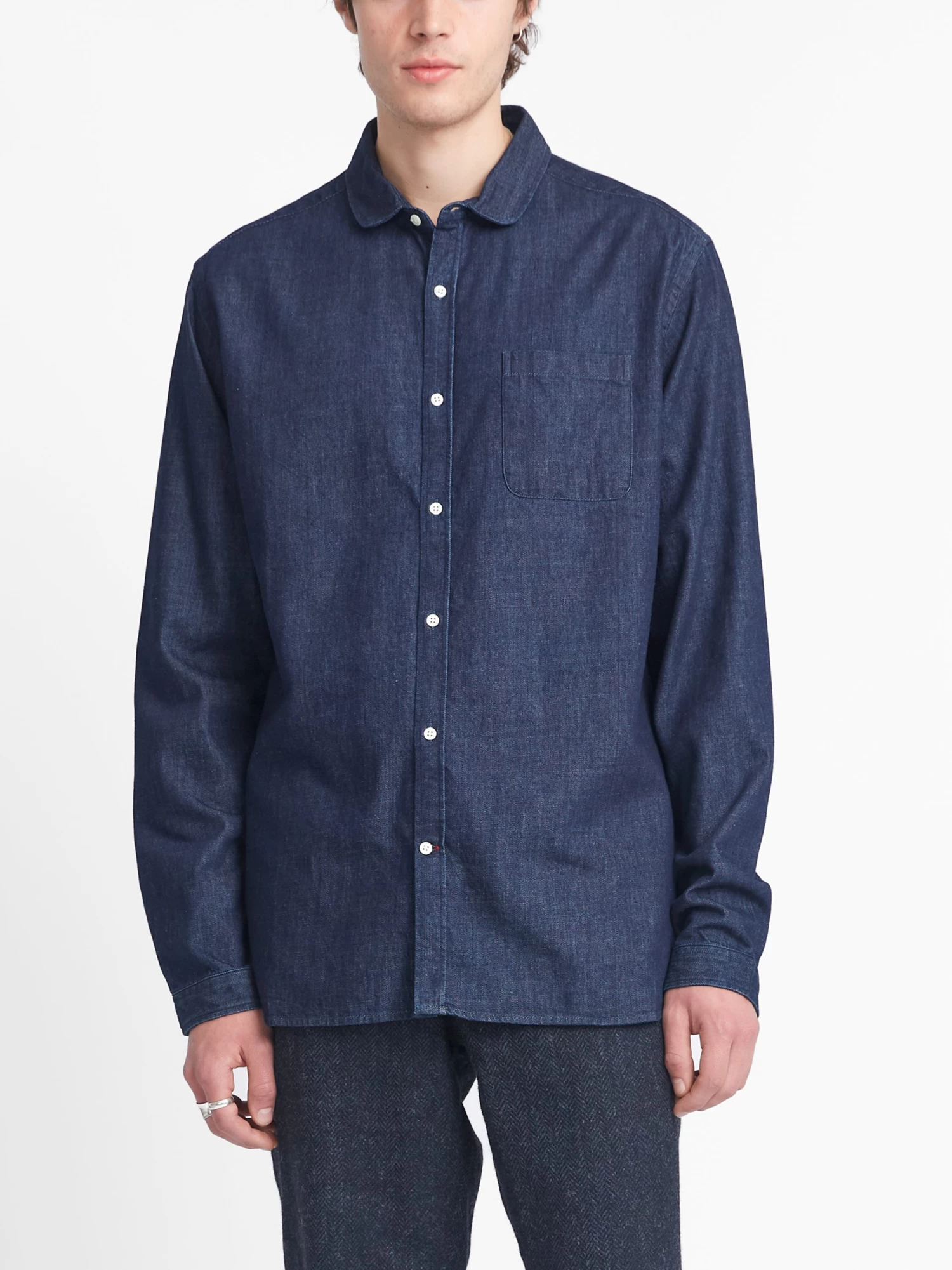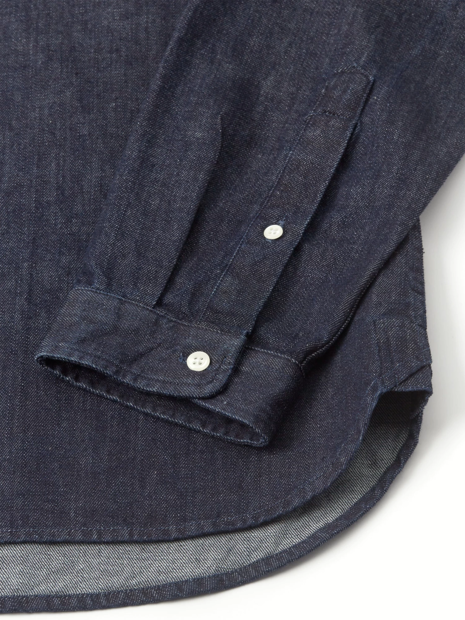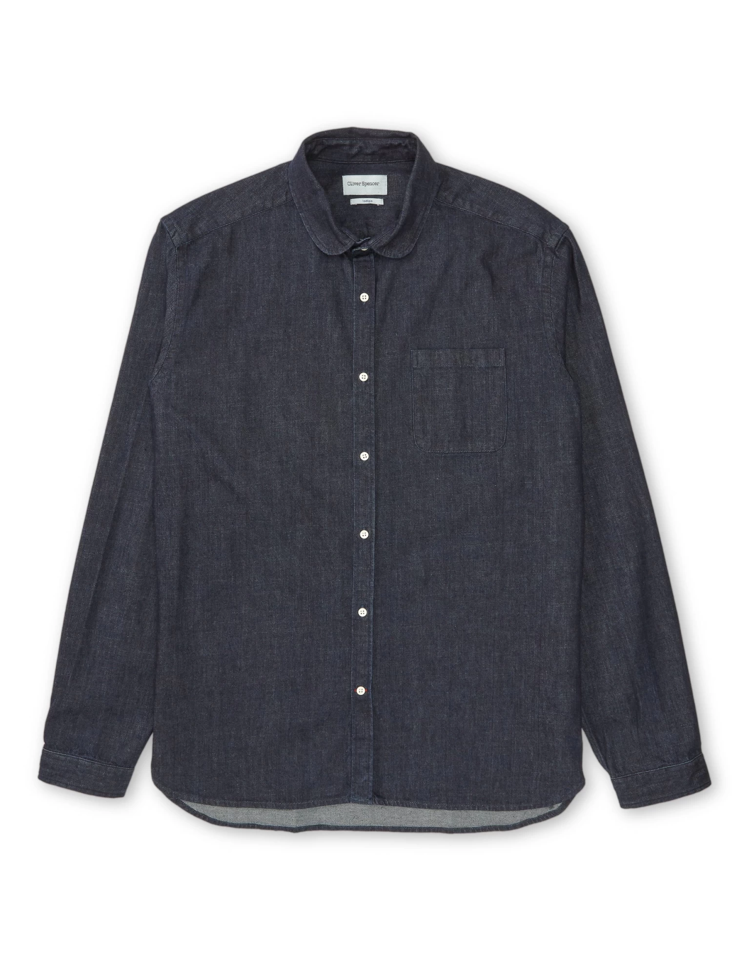 The Eton is one of our most popular collar shapes. Characterised by its neat curved shape, it is a relatively small collar which looks great buttoned up to the neck, with or without a tie, or can equally be worn unbuttoned. This classic denim version in a beautifully soft recycled cotton is great to pair with white/cream selvedge denim jeans for a double-denim look, or alternatively wear it with cream chinos for a modern preppy aesthetic.