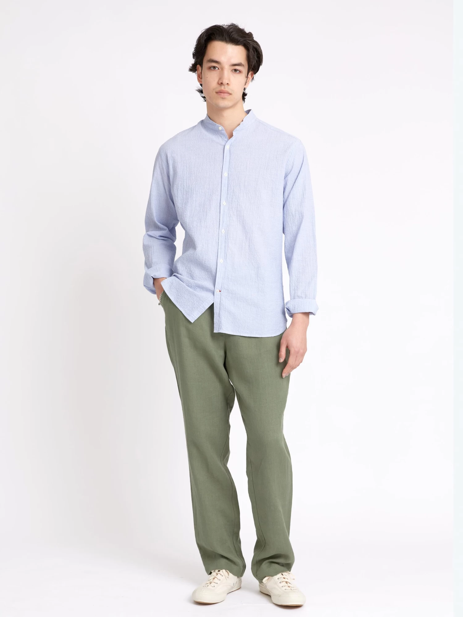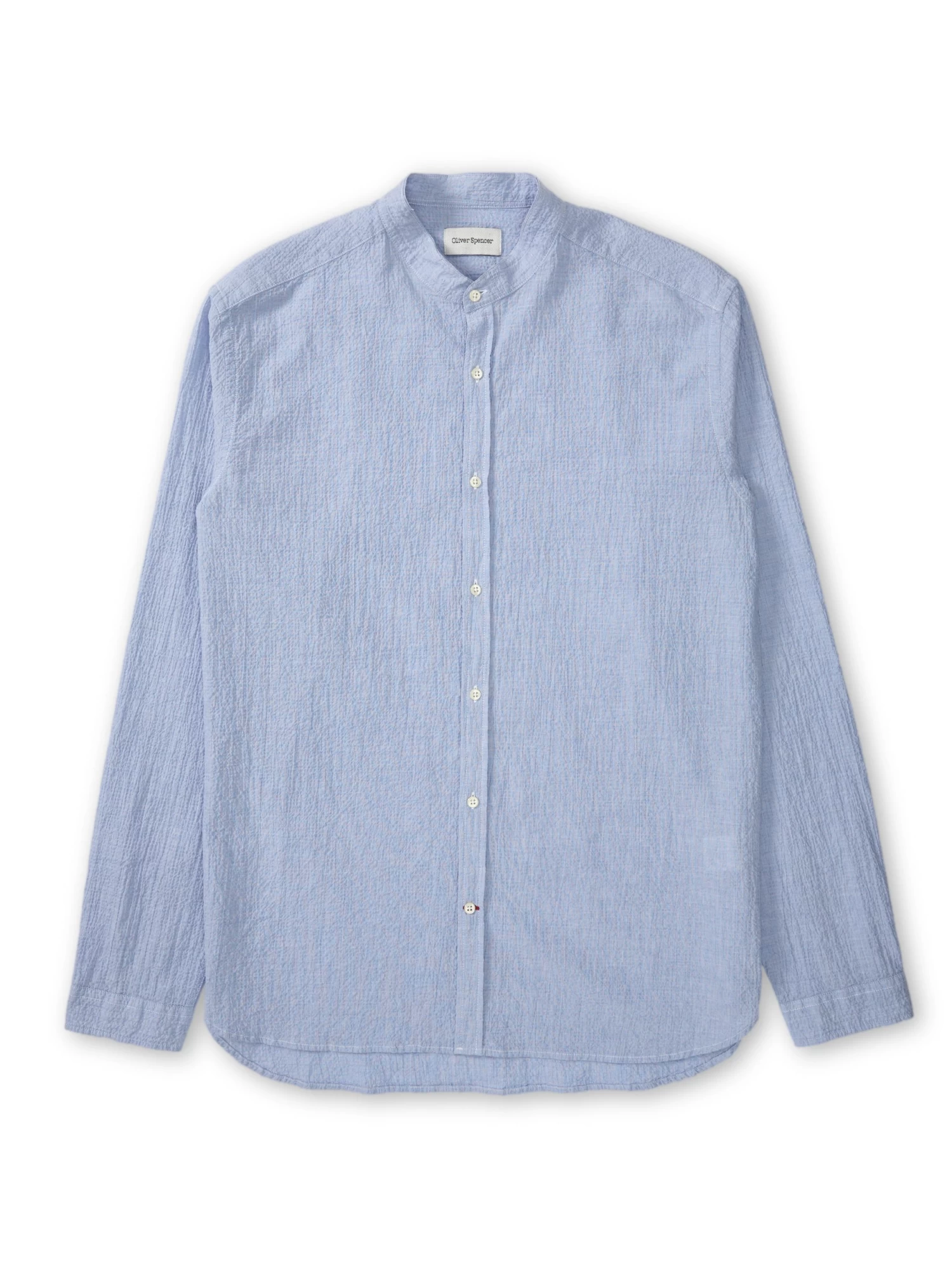 The grandad collar comes from humble origins, but has cemented itself in the pantheon of modern menswear. This style has been cut from a dimpled cotton with a subtle stretch. Pair with navy cotton trousers for a relaxed off-duty look.