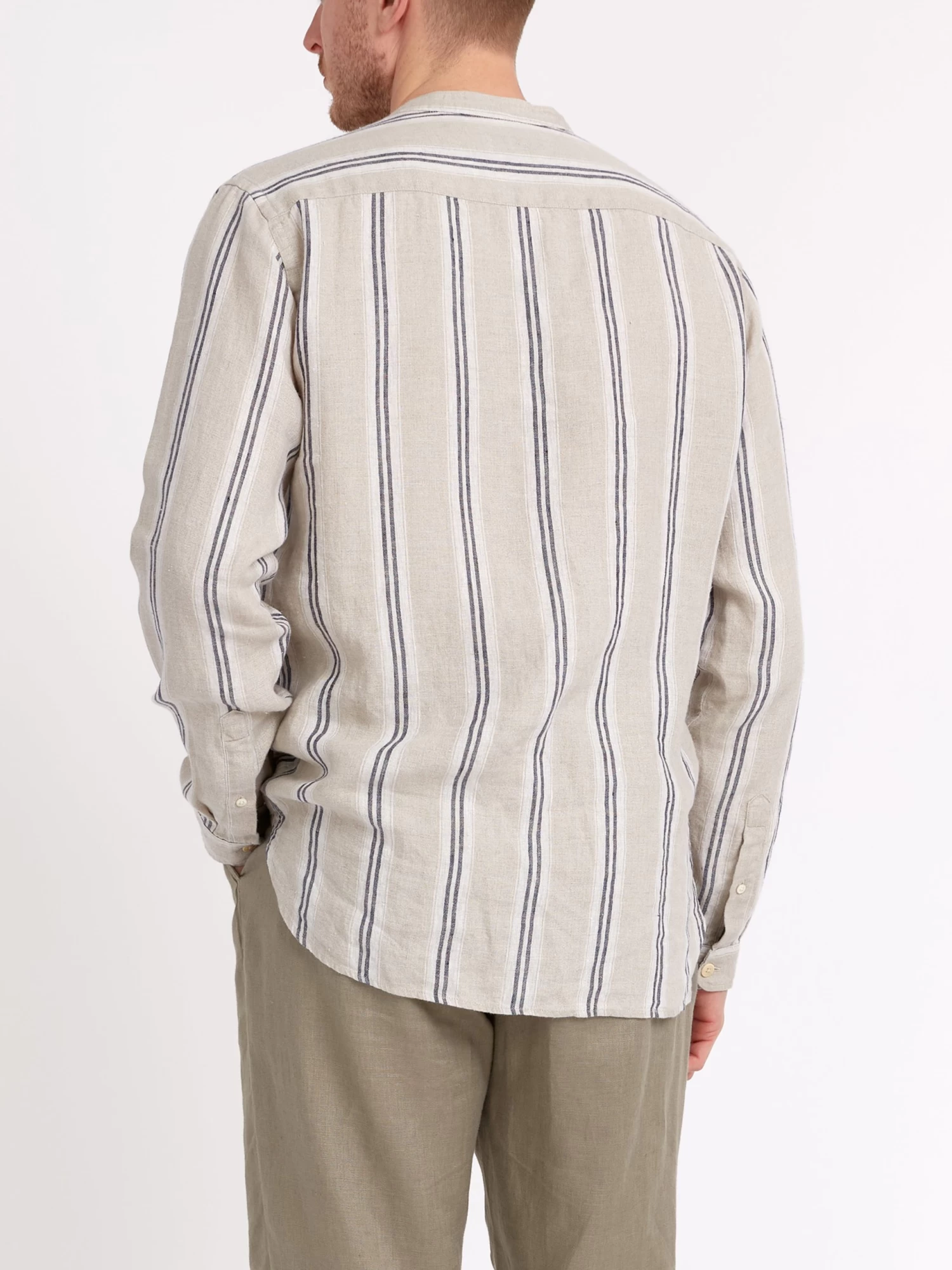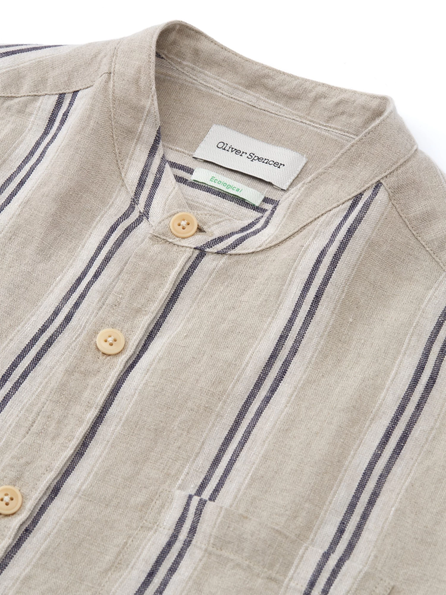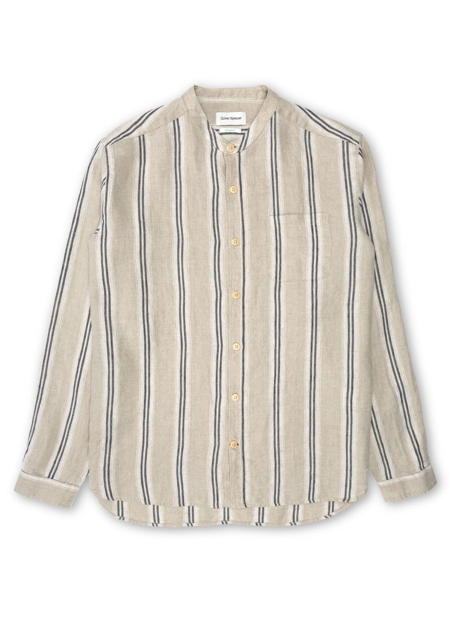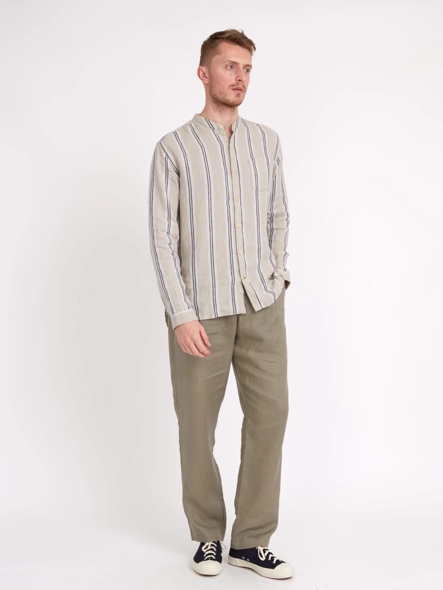 Born of utilitarian origins, the grandad collar has become a workwear classic, dressing down the archetypal men’s shirt to something altogether more relaxed. This version has been cut in 100% linen and features two-tone vertical stripes for a relaxed of-duty summer shirt that’s a breeze to style with our linen trousers and tailored shorts.