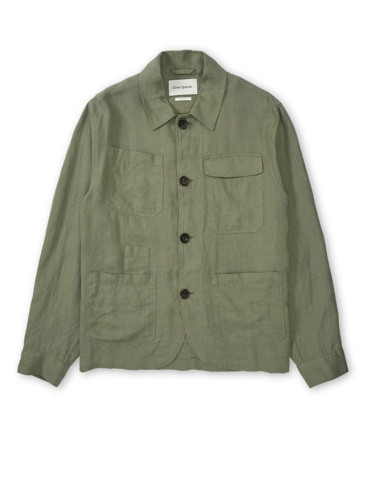 Constructed from 100% linen, the green Hythe jacket is a beautiful contemporary iteration of a classic four-pocket chore jacket. With a subtle textural finish thanks to the slubs in the linen, it makes for a versatile overshirt in the spring and summer months and it easily paired with both light tone and navy Oliver Spencer trousers.
