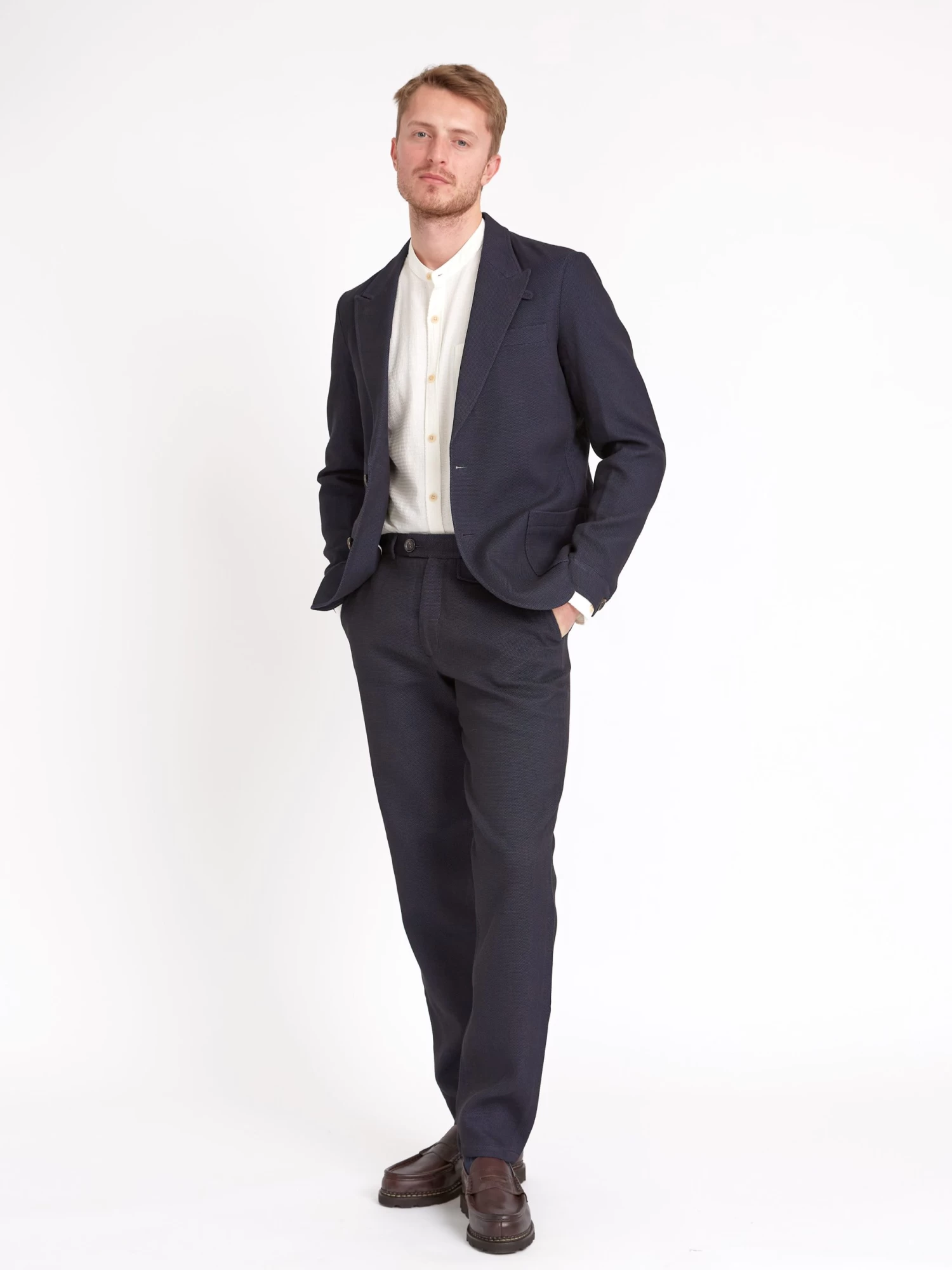 The Mansfield is a versatile unstructured style featuring peak lapels and a three button fastening. Relaxed and never stuffy, this textural navy style can be worn as part of a suit or used as a separate to give your wardrobe a plethora of new smart styling options.