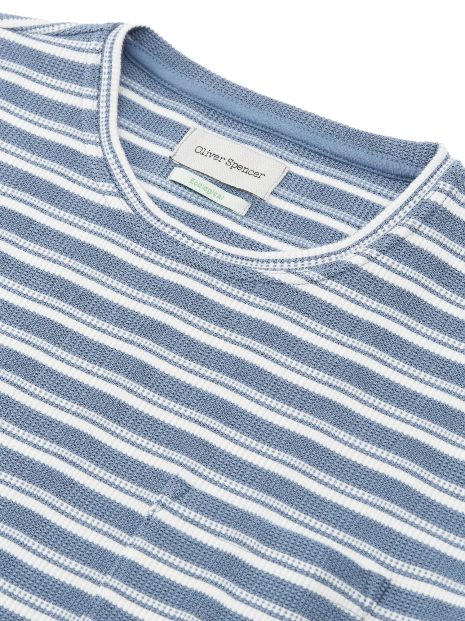 Crafted from a cotton and modal blend, Oli’s t-shirt is silky soft to the touch, and makes for a beautiful spring tee. This striped version pairs well with our indigo-dyed trousers as well as neutral sand tones too.