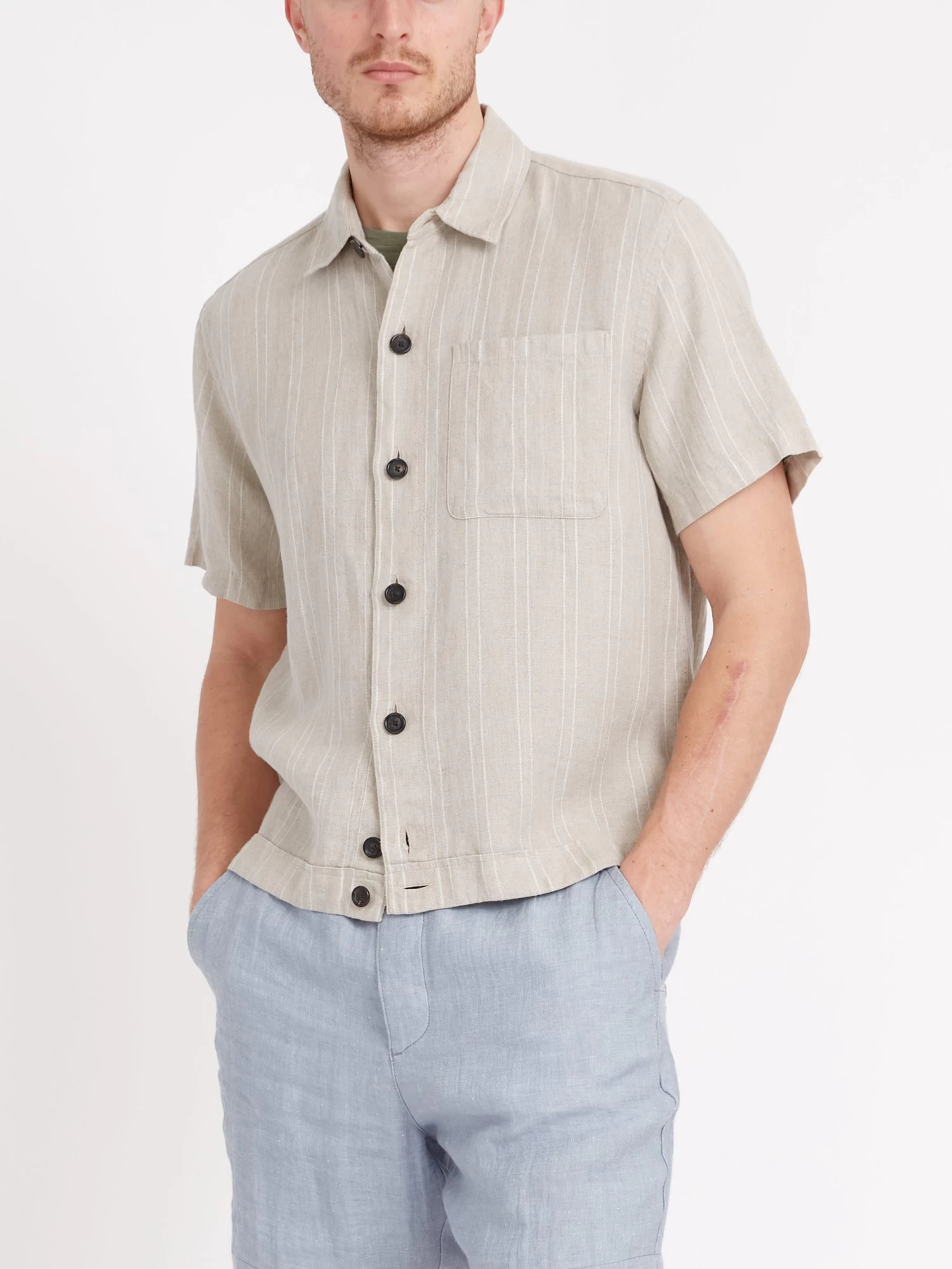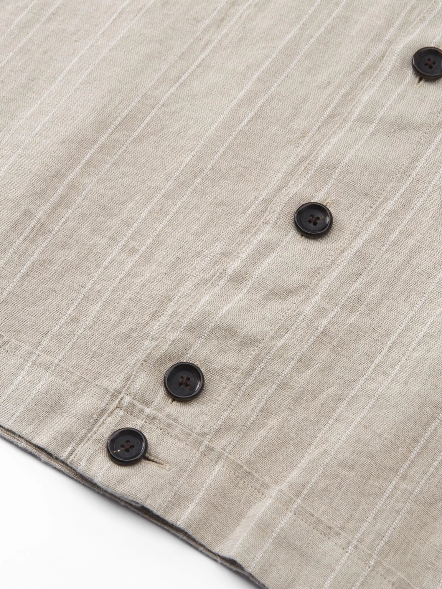 Crafted in a beautifully soft premium ecological linen fabric, our Milford shirt in Middelboe sand is a great summer option for casual fits and relaxed tailoring. Featuring a subtle chalk stripe pattern, it’s perfect to wear with pastel tones and creams for an understated look of relaxed elegance.