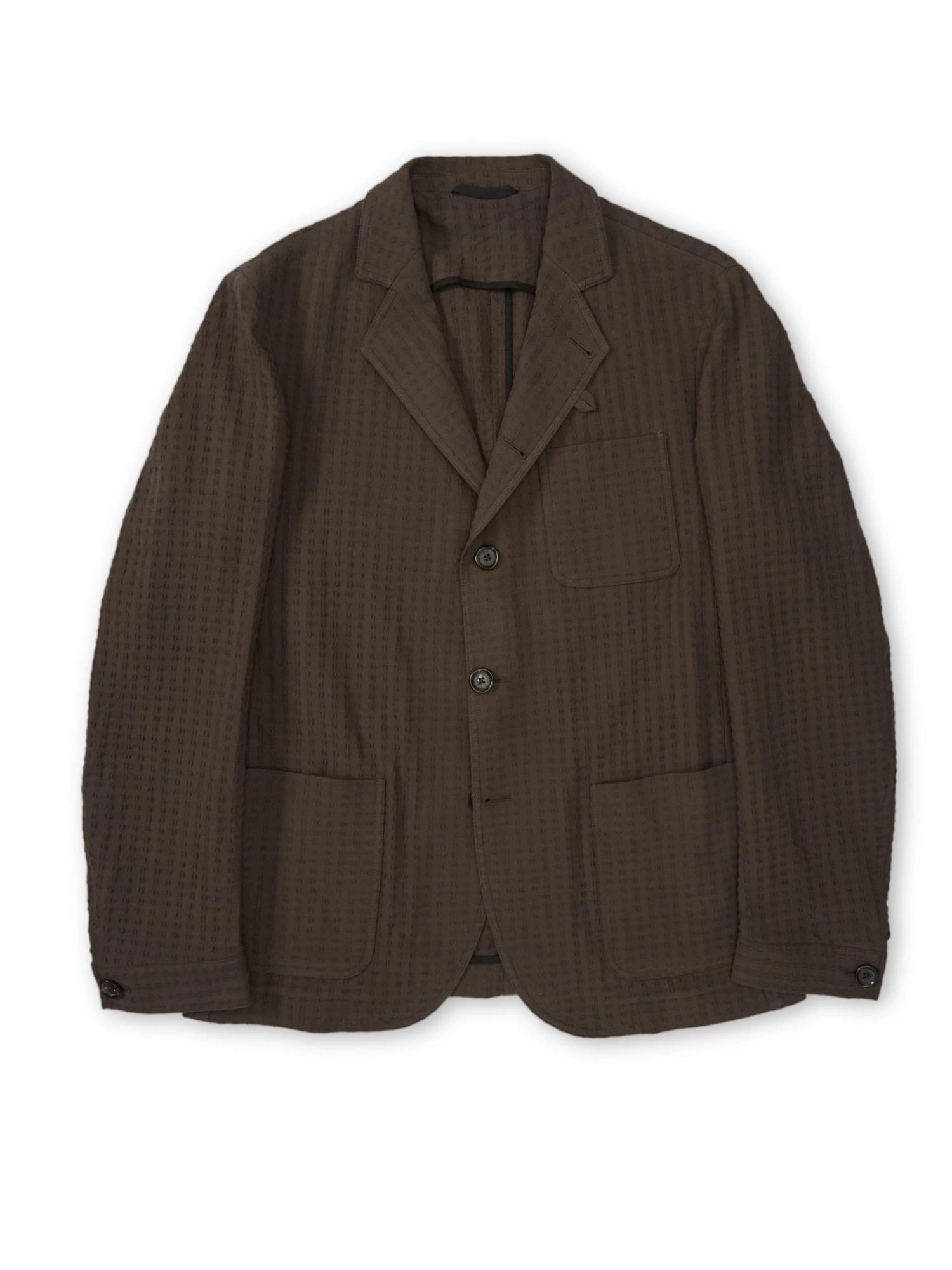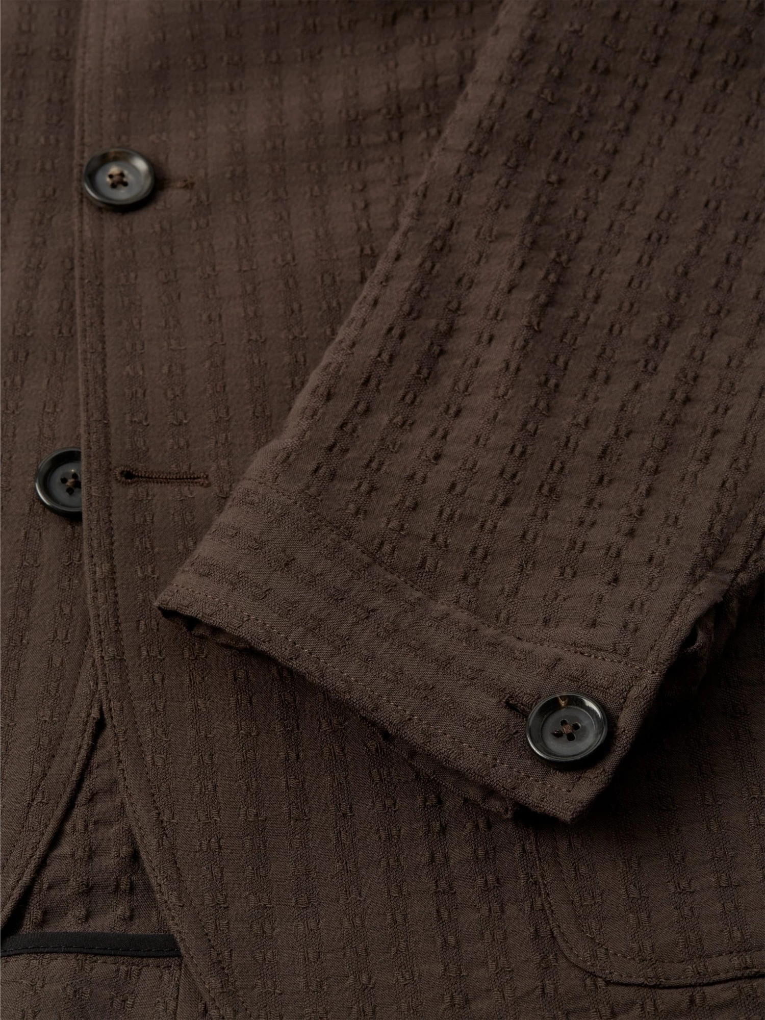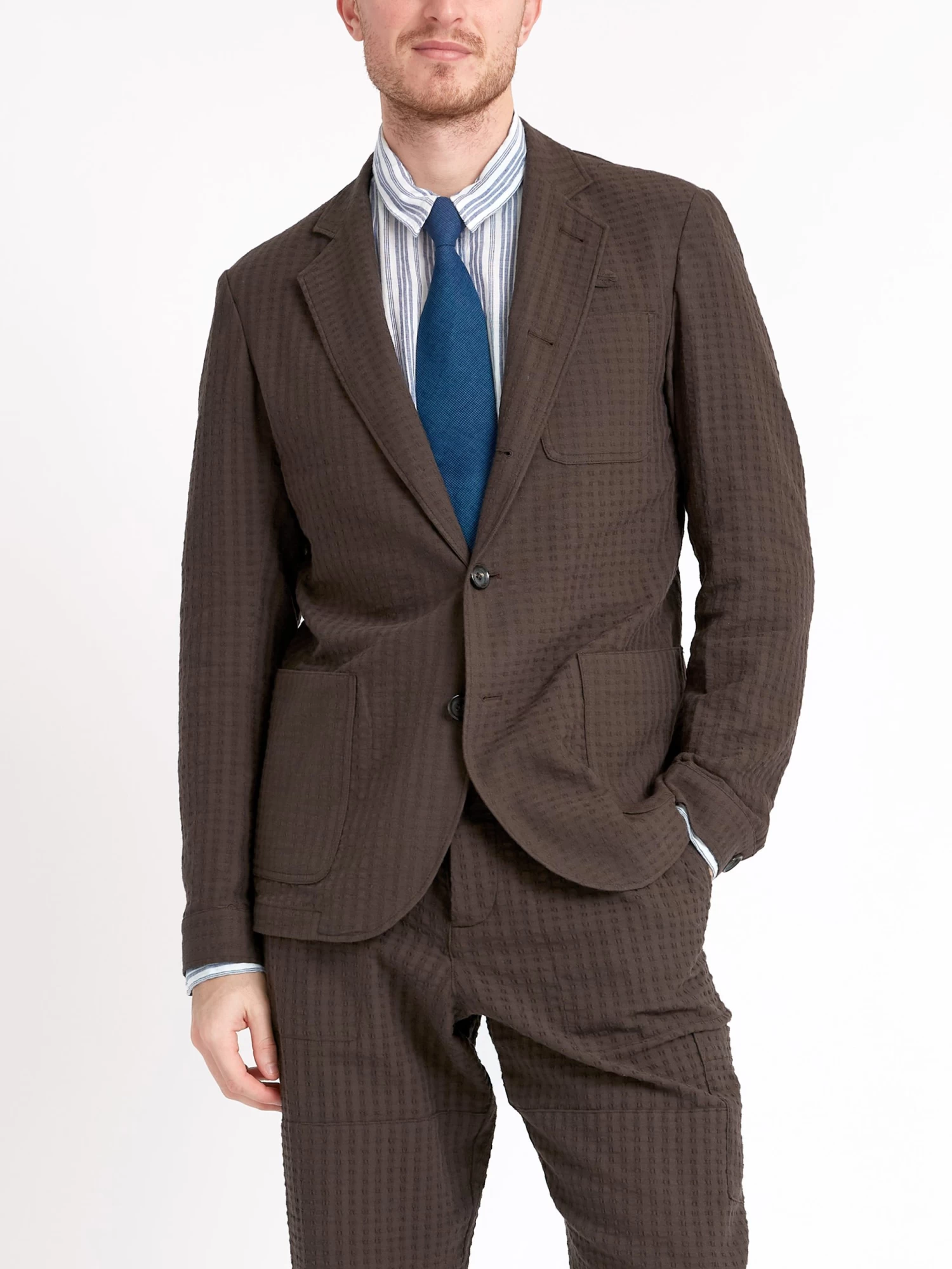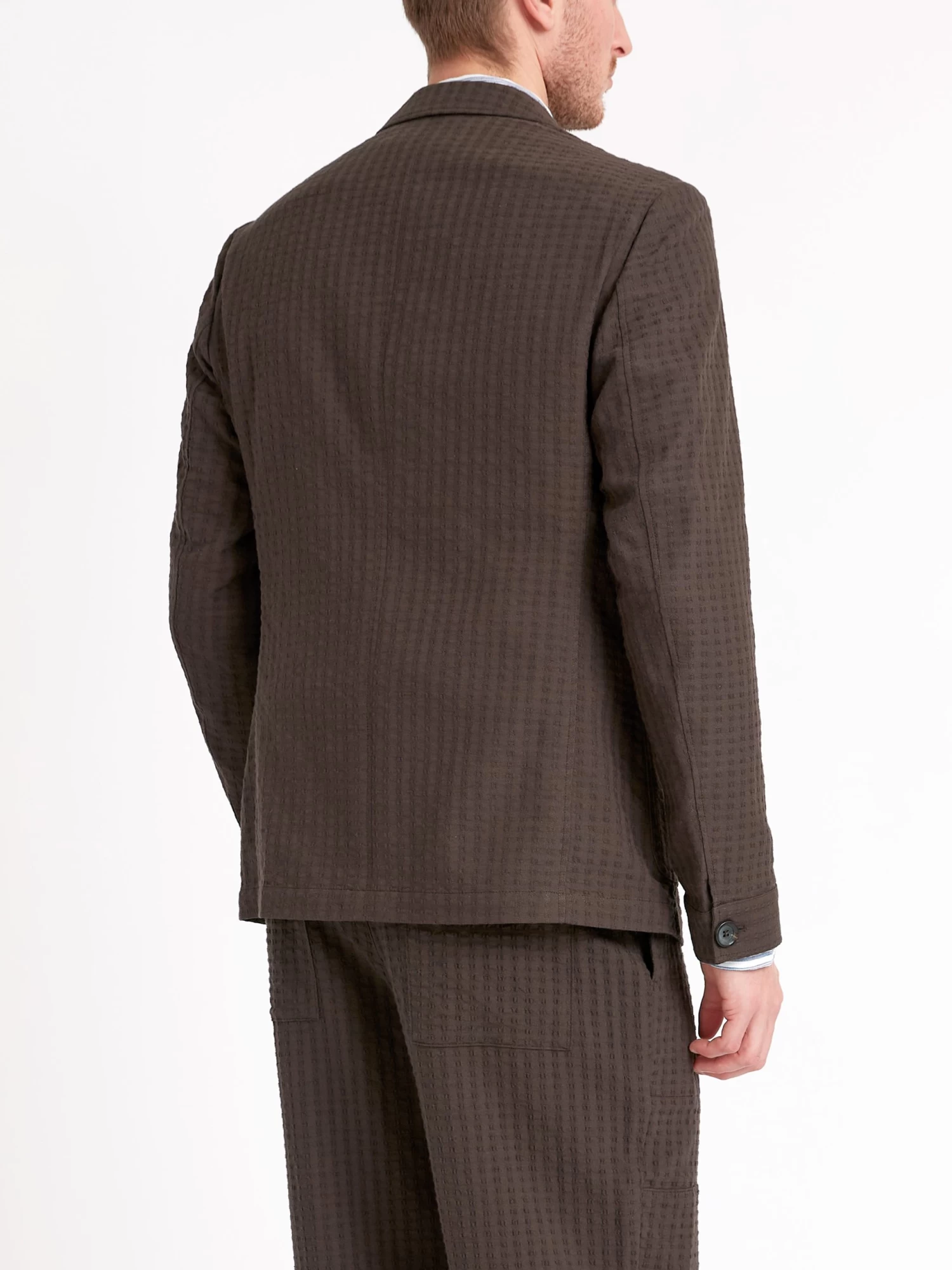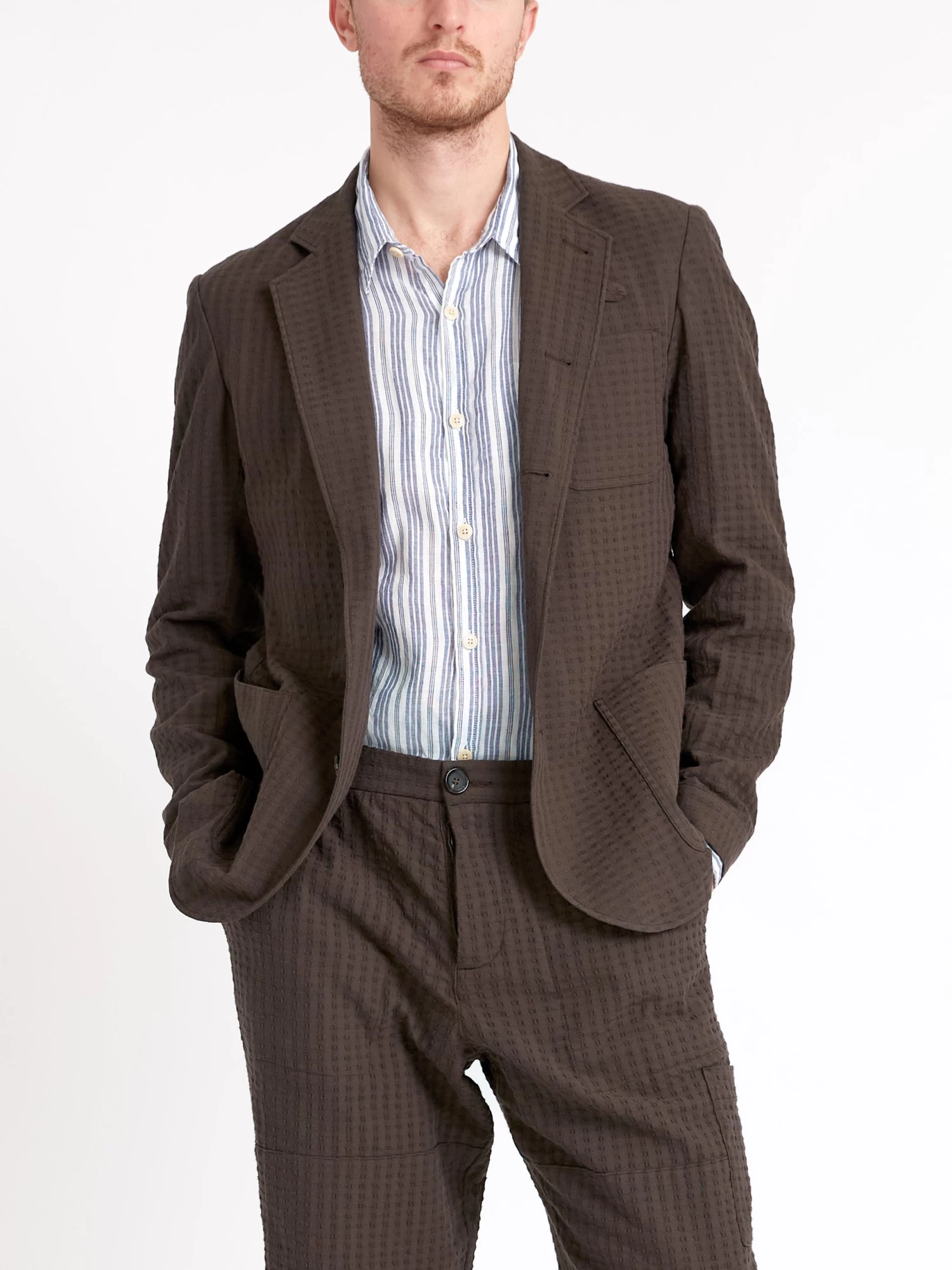 The Solms jacket is a signature piece from the Oliver Spencer collection; a five-buttoned, unstructured work-wear inspired jacket with a rolled lapel that allows you to button all the way through. Functional design, relaxed cut and partner to our William trousers to make up a casual suit. This brown version has been cut in an organic cotton blend with a slight stretch, and features a delicate stitch detail.
