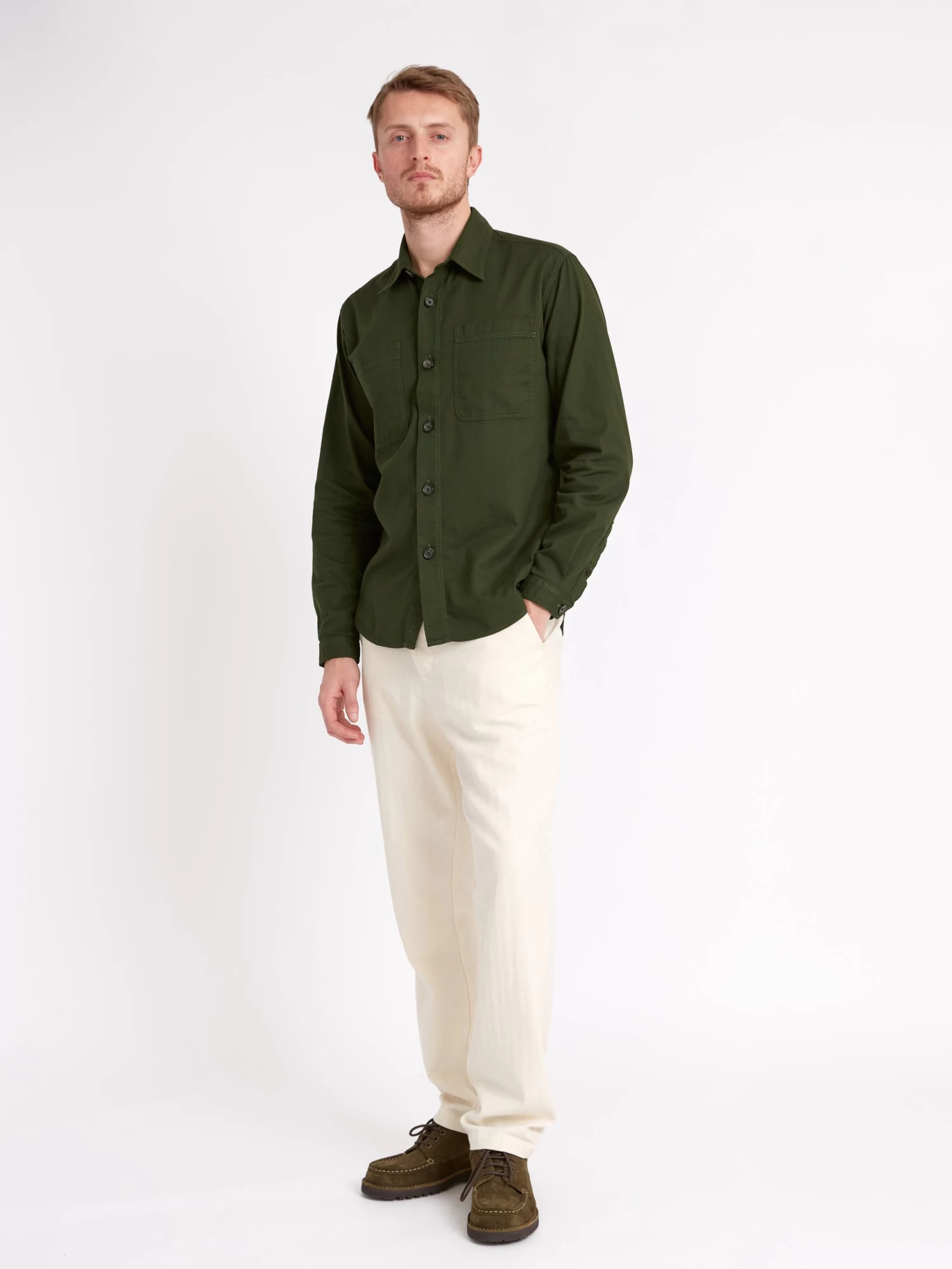 Inspired by vintage military shirt silhouettes, the Treviscoe shirt is a modern classic and a great fit for contemporary workwear wardrobes. This 100% cotton style in forest green is a great option for a breezy overshirt this season, paired with your favourite jeans or cotton chinos.